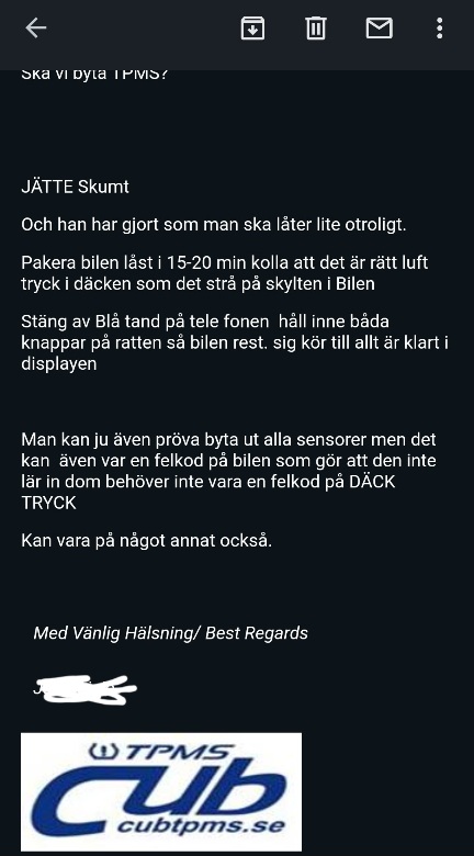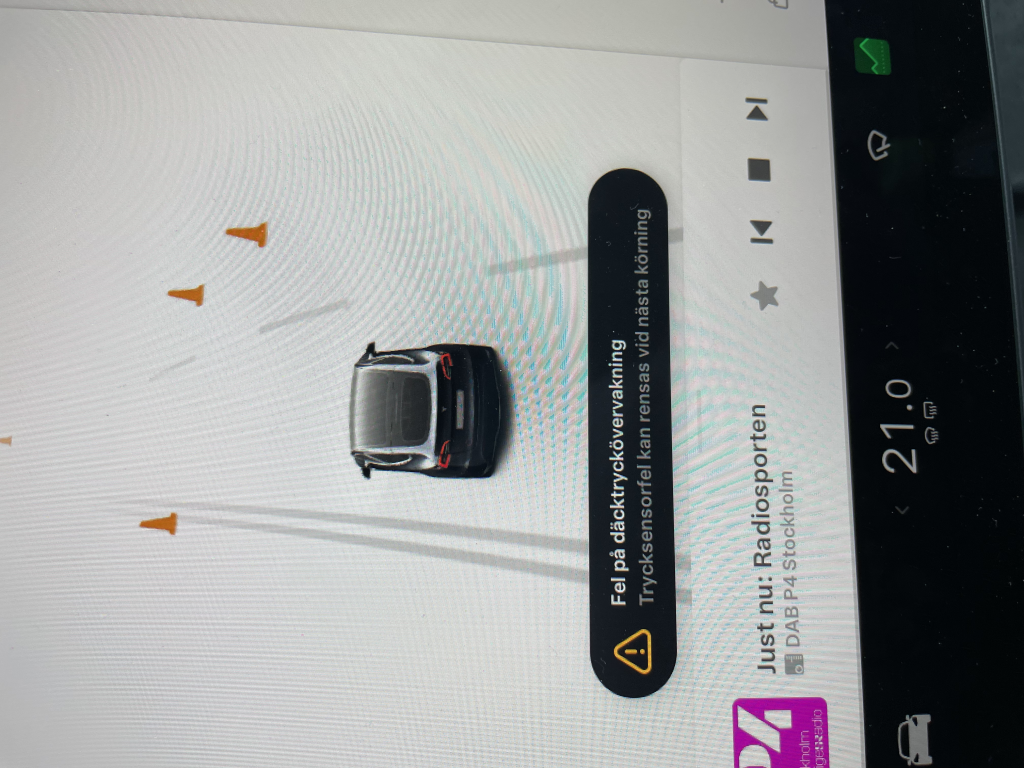 Jag satte på mina nya vinterdäck från tesla i helgen. Verkar som en av sensorerna är trasig, får samma fel som ovan. Ville bara spela in att teslas grejer inte heller är perfekta, nu får vi se om de svarar på serviceärendet snart.