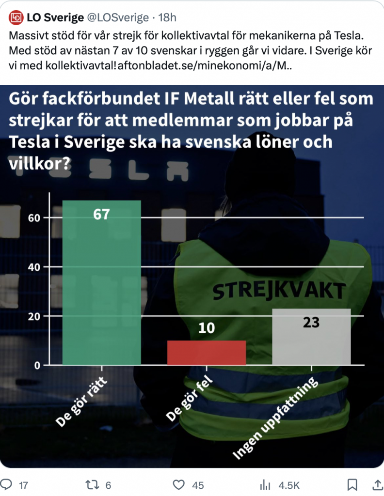Undrar hur resultatet blivit om de tillfrågade visste att 90% av de Teslaanställda jobbar vidare helt nöjda med sina anställningsvillkor och arbetssituation, att de inte intresserad av att arbetsgivaren tecknar avtalet, att facket stoppar privatpersoner utan koppling till Teslas verksamhet från att byta hjul på bilen, att få plåtskador åtgärdade, att privatpersoners bilar står inlåsta hos Werksta utan att repareras, att facket blockerar ett svenskt företag med kollektivavtal från att tillverka produkter som inte ska köpas av TM Sweden AB mm.