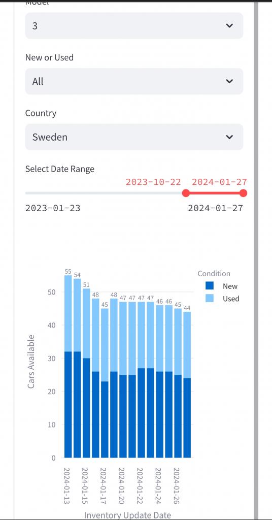 Har skapat en grej som hämtar lagerstatus för alla länder i världen. Den uppdateras runt kl 19 en gång per dag. Kan se både historik och filtrerar på begagnade och nya Teslor i lager.