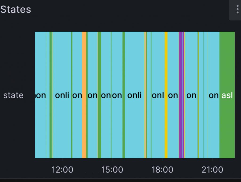 Lägger med en skärmdump som visar mina states de senaste 12 timmarna. Den gröna färgen är ”asleep”, lila körning, gul laddning och turkos är vaken. Den sista gröna stapeln, sover, är från det att jag avaktiverade Gridio helt och lät Tesla styra laddningen själv.
