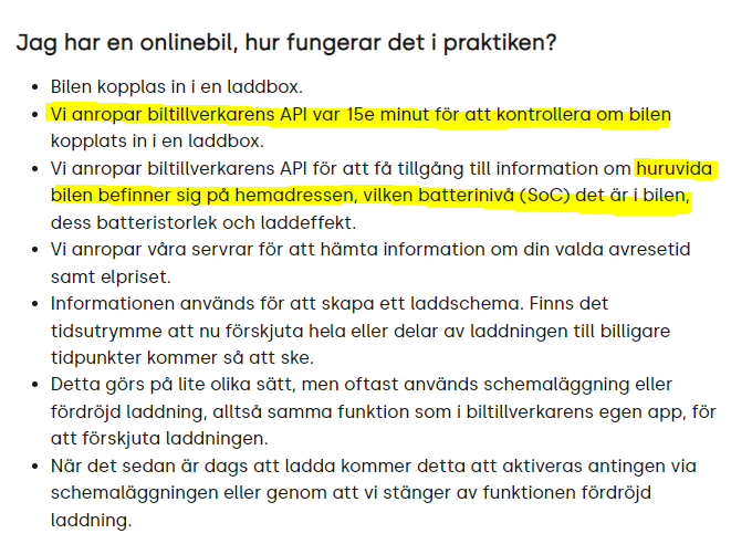 Även om smartladdning är avstängt på bilen och (som det ska vara) aktivt på laddaren så pingar Tibbers API bilen för att ta reda på om bilen befinner sig hemma och nuvarande SoC etc. för att kunna beräkna laddningsfönstret.