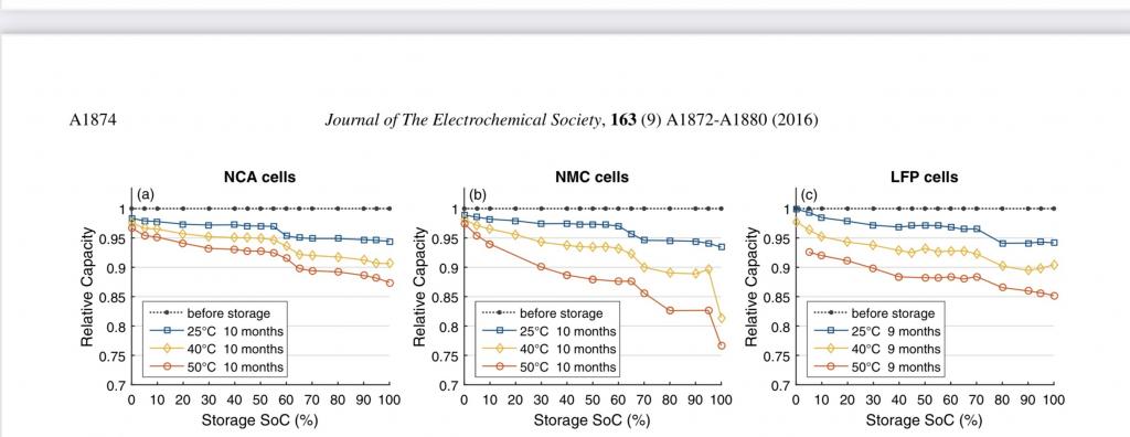 LFP kan stå med 100% utan att inre resistansen ökar speciellt mycket. För de andra batterikemierna så ökar inre resistansen betydligt mer över cirka 80%.