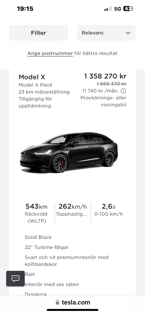 ...] jag har beslutat mig för att jag hellre kör min gamla S än en ny Y. Den har dock klara nackdelar också (tenderar att slita däcken snett, usla strålkastare, dålig luft i baksätet, ingen dragkrok mm mm) så egentligen väntar jag väl på att kunna byta till en icke-Tesla med fullgod räckvidd utan att ruinera mig. Men det ser lite småtrögt ut.