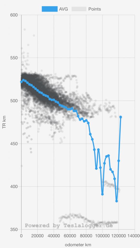 Gjorde en approx lite snabbt med att du laddade till 80% de första fem månaderna sedan 50% under resterande tid, och att bilen är 30 månader ungefär. 5.6% degradering/ 74.3kWh idag med datan för Panasonic NCA. De är rätt lika, men LG brukar vara snudden bättre.