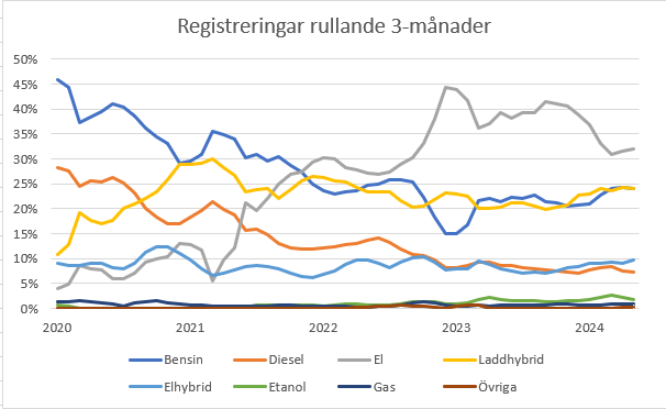 Det är fortfarande sämre än förra året men fortsätter de att ha över 30% och laddhybrider fortsätter att ha över 20% så lär vi fortsätta se att bränsleförsäljningen i Sverige fortsätter neråt. Det ska bli intressant att se hur långt den kan falla innan det börjar diskuteras i media.