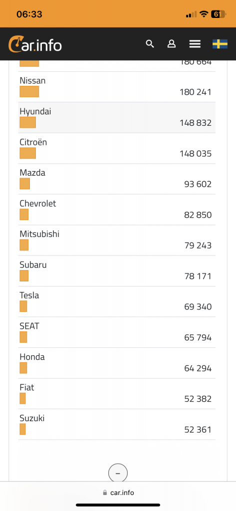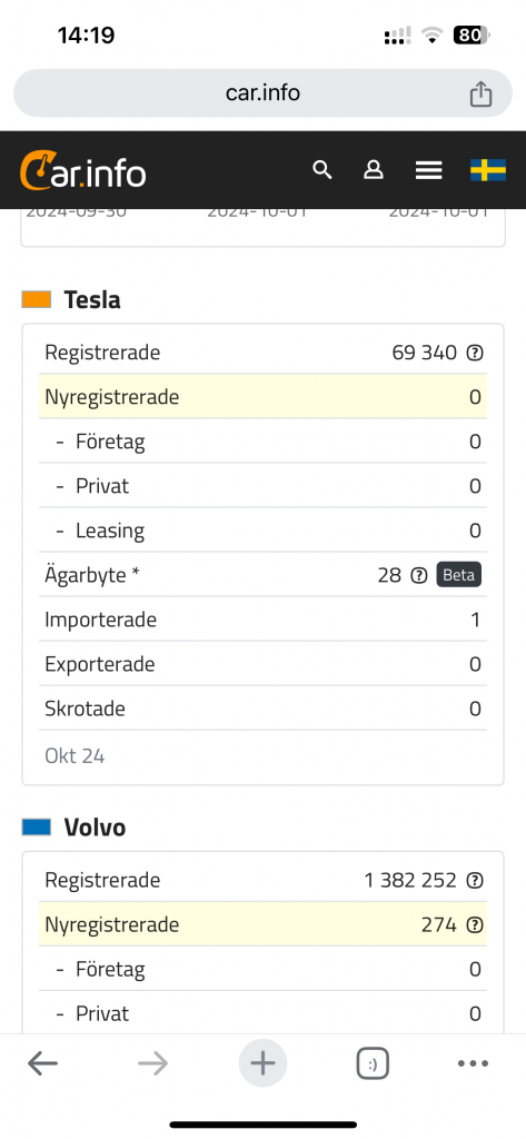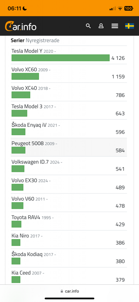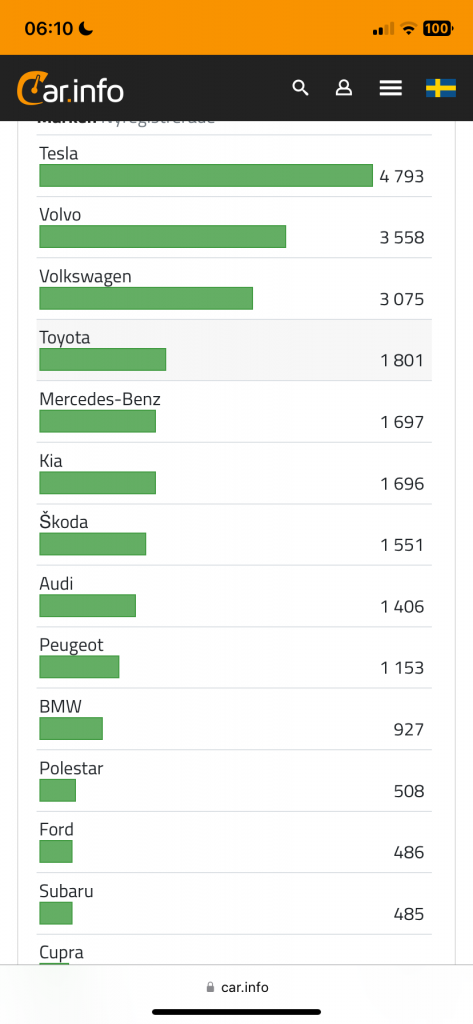 Nu räknas väll statistiken från Mobility Sweden mer som den ”officiella” statistiken men kollar vi på Car.info så gjorde tesla en galen månad under september. Kom nästan upp i 5000 bilar levererade på en månad vilket gjorde dem till den vanligaste tillverkaren. Visst, tesla fokuserar på slutet av kvartalet men det är över 150 bilar om dagen de har levererat i snitt.