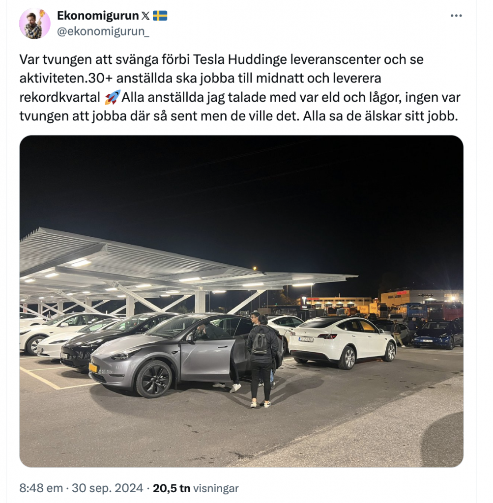 Sist men minsta rekord var faktiskt för årets första 9 månader där Tesla nått 16 502 leveranser mot det förra rekordet från 2023 på 16 492. Rekordet slogs alltså med 10 bilar vilket dock ändå får ses som ganska imponerande med tanke på Teslas produktionsproblem under början av året.