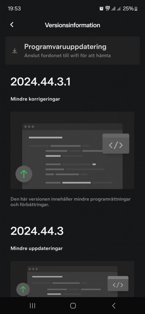 ??mikebike skrev: ↑15 dec 2024 08:49Nej, det är en helt oviktig faktor.Freez skrev: ↑15 dec 2024 08:06En viktig faktor är att ansluta bilen till ett väl fungerande Wifi när den står parkerad. Tveksam till att internetdelning vid färd hjälper.Zkronk skrev: ↑14 dec 2024 19:33Tack! Jag har ändrat från Standard till Avancerad nu, och kört runt med internetdelning aktiverat på telefonen idag.Freez skrev: ↑14 dec 2024 08:54Ett tips för att få uppdateringar snabbare.