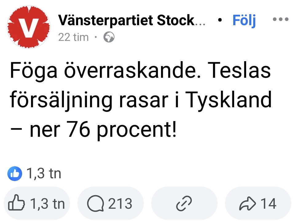 Jag är övertygad om att det precis som i USA främst är den vänstra halvan av politiken som valt en stor andel Tesla av sina nybilsköp. Vänstern har definitivt lyft fram Tesla, anekdotiskt pratade t ex Magdalena Andersson som finansminister för flera år sedan ofta om hur Svensk ekonomi gick som en Tesla.
