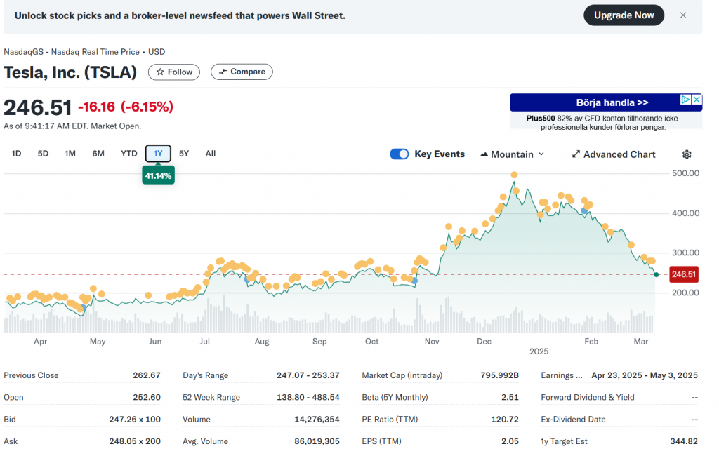 Kursen för fem år sedan, 2020-03-11 låg på $42, så köpte du TSLA då för $1000 skulle du kunna sälja dem idag för $5285.spacecoin skrev: ↑11 mar 2025 08:00Om du köpte TSLA för $1000 år 2020 skulle du kunna sälja dem idag för $1000. I morgon, vem vet?Melon Must skrev: ↑11 mar 2025 07:17Snabbt ner när det gått för snabbt uppåt är en bra sammanfattning. Uppgången har ju varit helt otrolig efter valet utan någon anledning.granlundii skrev: ↑10 mar 2025 15:00Jo, har tappat över 50% från toppen. Går snabbt neråt när det gått för snabbt uppåt...![]()