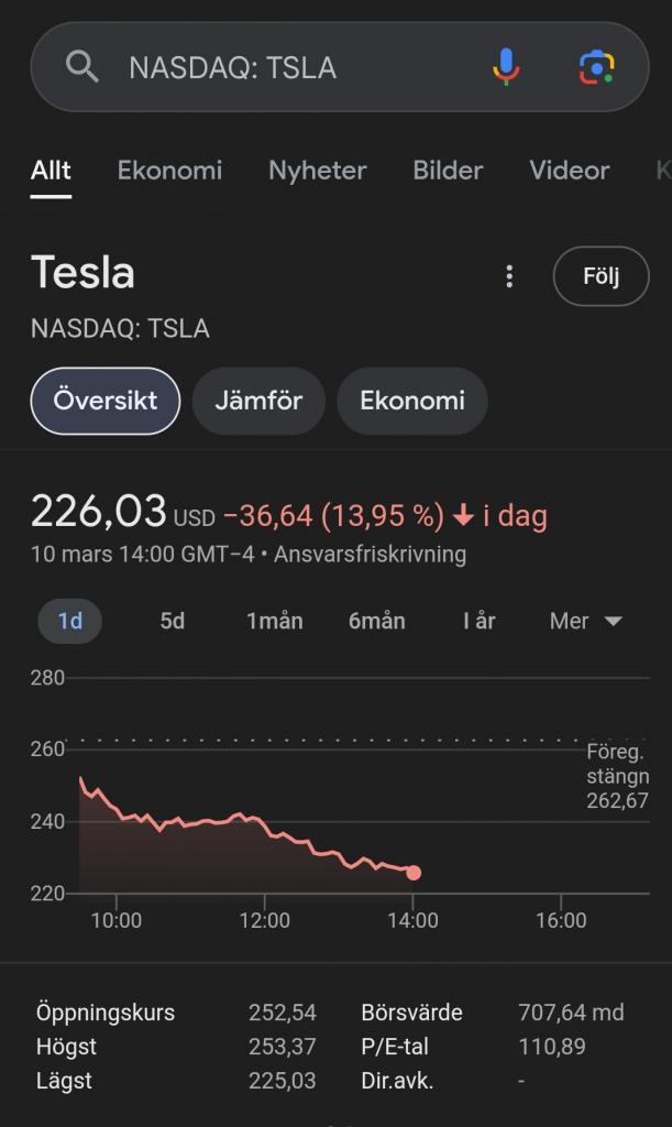 I slutet av 2020 låg kursen på samma nivå som idag.TiborBlomhall skrev: ↑11 mar 2025 08:58Kursen för fem år sedan, 2020-03-11 låg på $42, så köpte du TSLA då för $1000 skulle du kunna sälja dem idag för $5285.spacecoin skrev: ↑11 mar 2025 08:00Om du köpte TSLA för $1000 år 2020 skulle du kunna sälja dem idag för $1000. I morgon, vem vet?Melon Must skrev: ↑11 mar 2025 07:17Snabbt ner när det gått för snabbt uppåt är en bra sammanfattning. Uppgången har ju varit helt otrolig efter valet utan någon anledning.granlundii skrev: ↑10 mar 2025 15:00Jo, har tappat över 50% från toppen. Går snabbt neråt när det gått för snabbt uppåt...![]()