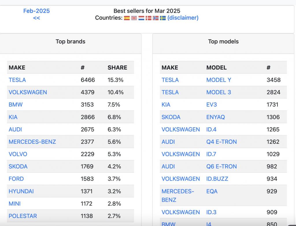 Statistik är ju alltid statistik, kan vara värt att förtydliga att Model Y är den tredje mest registrerade ELBILEN hittills i mars. Finns laddhybrider som säljer bättre, t.ex. Volvo XC60 är en.