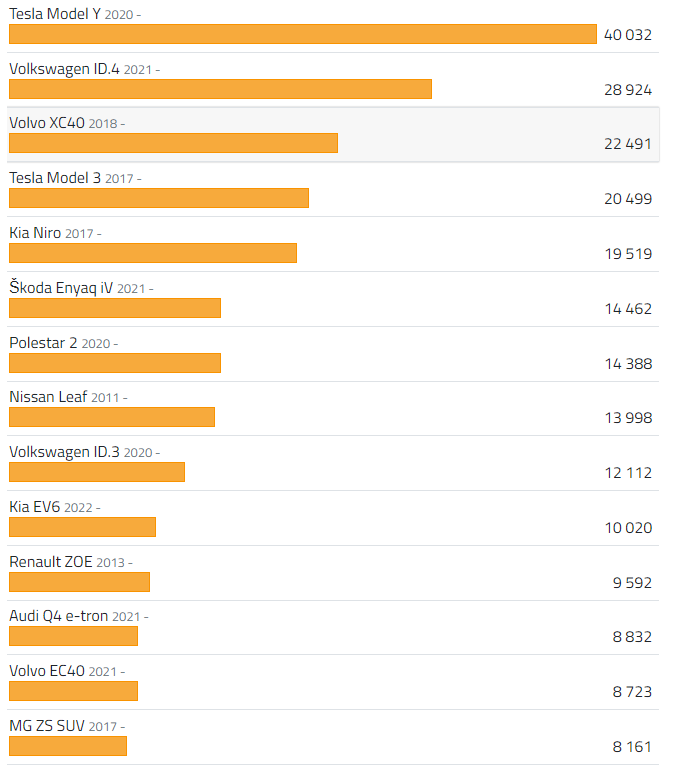 Känns nu lite konstigt att den sista på listan ha mindre än 10% av förstaplatsen, bör bli lite mindre skillnader framöver. Antalet elbilar som är över 10 000 har ökat något på senare tid och lär fortsätta öka framöver då både ID7 och EX40 närmare sig. För att hitta någon på listan som säljer bättre än Model Y i år så är det bara EX40 och ID7 så det kommer ta ett bra tag innan någon utmanar förstaplatsen om inget väldigt drastiskt händer.
