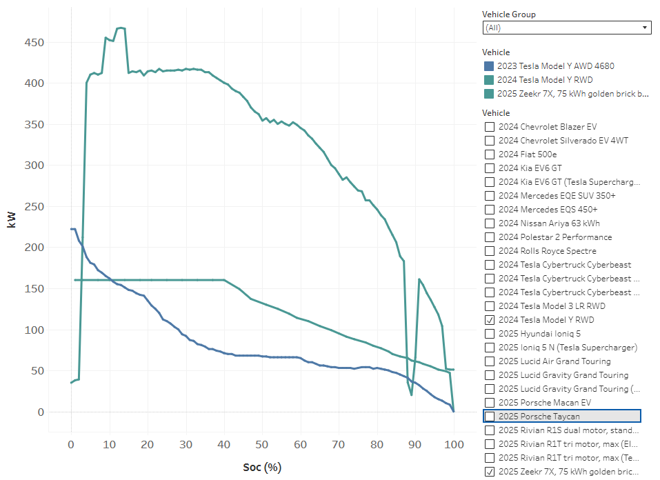 Här har du länk till laddkurvor för de bilar som OutOfSpec testat. Vad gäller Zeekr så är det 75 kWh batteriet som gäller här. Jag la in Tesla Model Y Performance och Long Range som jämförelse. Dock var ju detta inte en produktionsbil men den borde ge lite hint om hur kurvan ser ut. De använde också en riktigt snabb laddare under testet. Länk till sidan: https://outofspecstudios.com/charging