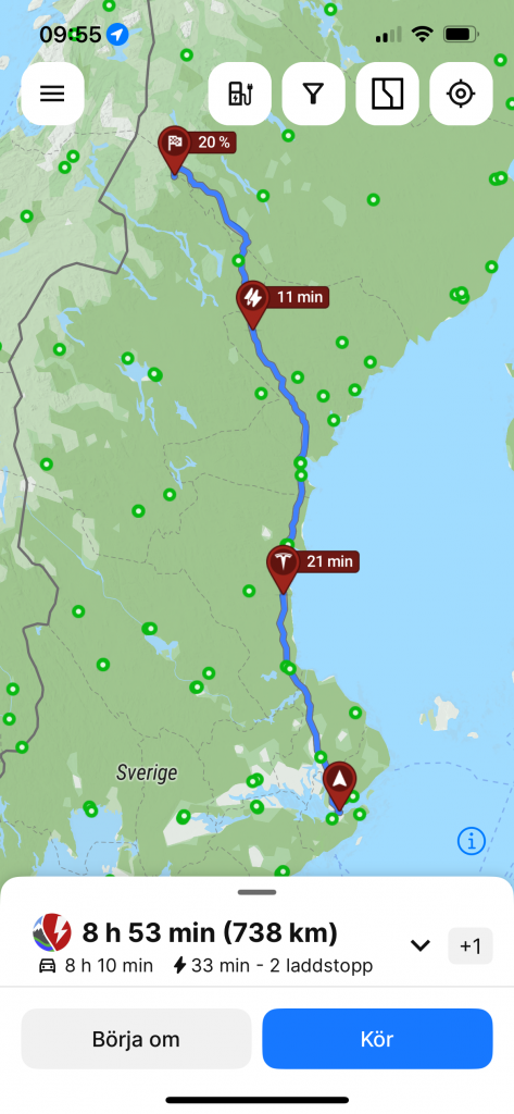 Jag förstår det, men förutsatte Du hade växelströmsladdare i Borga… Ptja, stannar Du lite extra i Ramsele kommer Du utan bekymmer fram med mer än 50%.