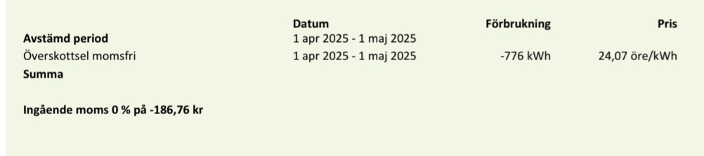 Jag fick 9,69 öre i ersättning per kWh av Bixia i april, totalt 86 kr.
