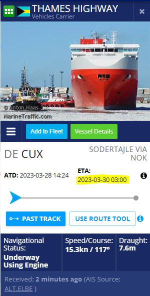 Vet inte hur det funkar ifall det går att göra "klart" allt innan båten anländer till hamnen?Teslabilen2023 skrev: ↑28 mar 2023 11:25Ja, kommer dom iväg nu och det tar lika lång tid tillbaka kommer det fram sent den 31:a. Blir till att springa på och köra av den egna bilen fort som fan innan det slår om till midnatt.Bengansgehe skrev: ↑28 mar 2023 11:22Tror också att det blir svårt att hinna tyvärrFlyingCarpet skrev: ↑28 mar 2023 11:15Tom Sawyer ligger i Zebrugge nu och enligt Marine traffic tog det 3 dagar och 10 timmar att åka dit från Södertälje. Svårt att hinna tillbaka till fredag 31a eller?![]()