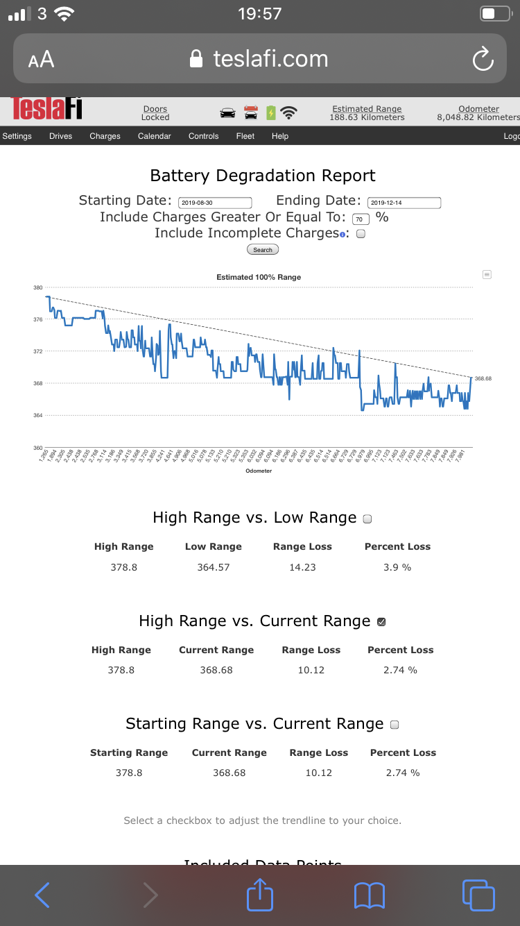 Verkar vara typiskt att ligga på ca 5-6% tapp enligt bilens räckvidd. Dessutom intressant att du Max3 ligger på ca samma efter din tidigare lägre räckvidd. Jag laddar alltid 80%, men skall nog testa 90 några gånger och kanske 100% en gång då det var länge sedan.