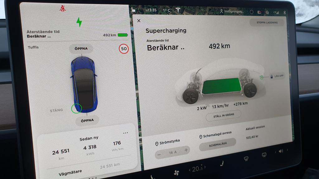 Vi har kört en del resor också, uppskattningsvis 1200 av milen är resor med Supercharging. Har då försökt undvika att ladda mer än 80-90 %. Har för mig att vi har laddat till 100% 3-4 ggr totalt sett sedan ny.