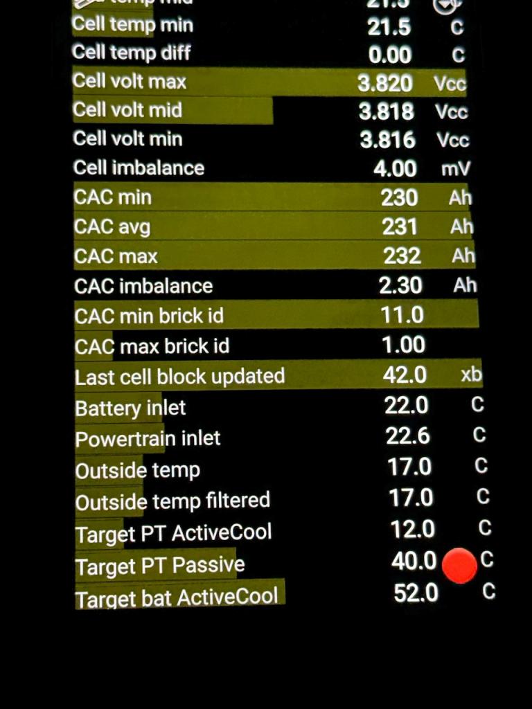 Jag har 2,90 Ah i CAC imbalance vid 44% SOC. Har android SMT och inte beta versionen, men kan CAC vara fixat nu i appen nu? Åtminstone står det under nyheter : added CAC for model S Fixed Model 3 CAC, Fixed Ideal Range for model 3 (rated range is removed), Supports 108 cell voltages for all cars (Plaid, 3/Y LFP).