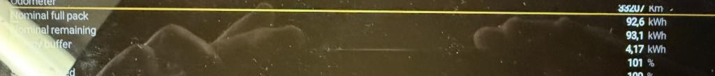 Laddade fullt idag, mätaren visar 532km och följande ur SMT. Haft SMT sedan bilen var ny, högsta värdet jag sett var runt 97kWh. Bilen har gått 3900mil. Bilen stod parkerad länge hos Tesla i somras, när jag lämnade den hade jag 94-95kWh NFP, märkligt att den tappat 2-3kWh när den haft under 40% SOC under sommaren.