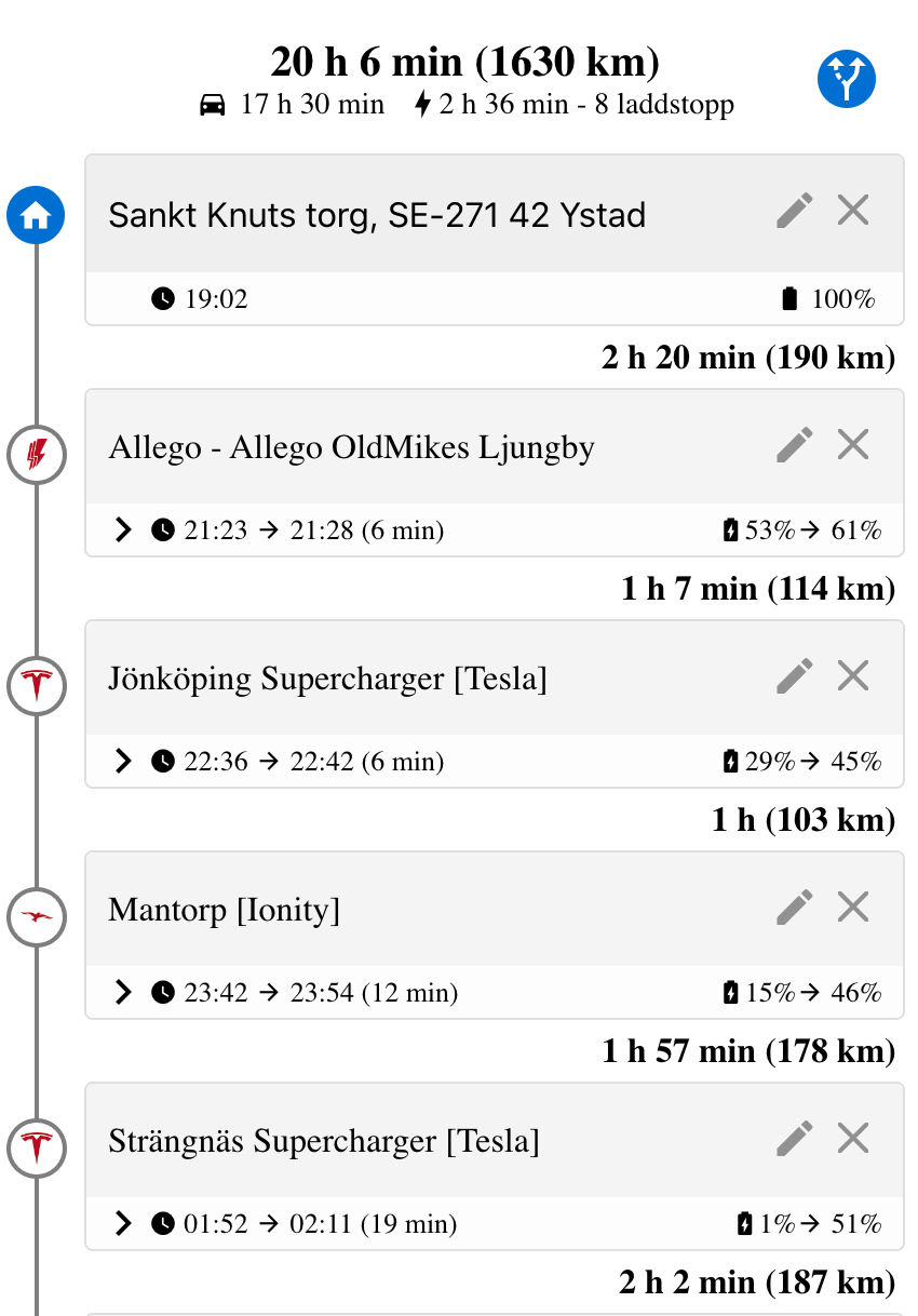 Jag har testat att fippla med inställningarna och drog till slut ner det så att jag bara vill ha 1% kvar vid ankomst. Öven testat att ändra mellan snabbast ankomst och korta eller långa laddstopp. (Snabbast ankomst borde ju vara bäst...) Trots det väljer den flera laddstopp i början av resan utan att man kör ner den till 1%.