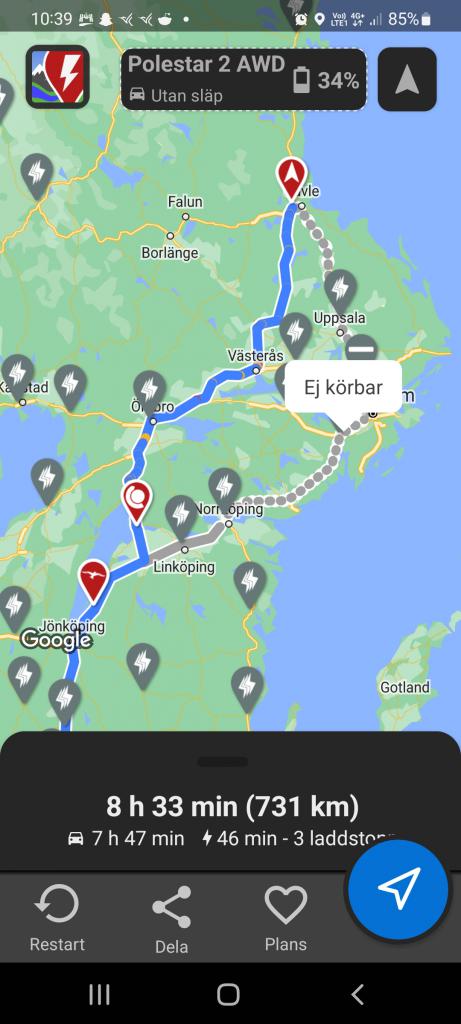 Toppen! Ja jag testade också nu och den använder SuC, tyvärr verkar det inte göra någon större skillnad på de resorna vi gör ofta. Den säger fortfarande runt dubbla laddtiden för en BMW i4 M50 och en Polestar 2 LR mot en Model 3 LR när jag kollar Stockholm - Göteborg och Stockholm - Åre, nästan så jag undrar om det verkligen kan stämma att det är så långsamt.chaffis75 skrev:Jag testade abrp nu precis och när jag test planerade en resa till sälen så använde den suc Torsby. Har id3 inställt i appen.