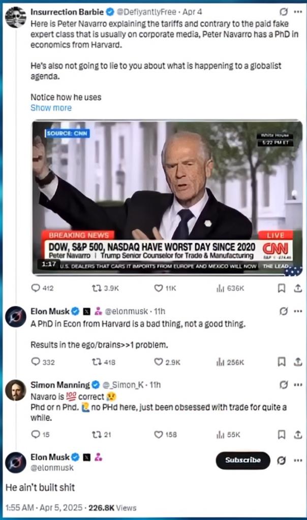 Replay från Elon kring Peter Navarro och hans PhD från Harvard.