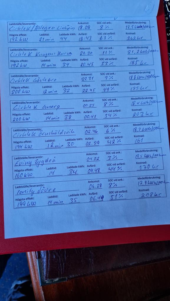 Som ni ser blev det en hel del laddningar och det beror som sagt på att bilen inte presterade som den gjort tidigare. Trots korta och effektiva laddningar (laddade max 40-46%) så blev laddtiden 9 min längre än ifjol.