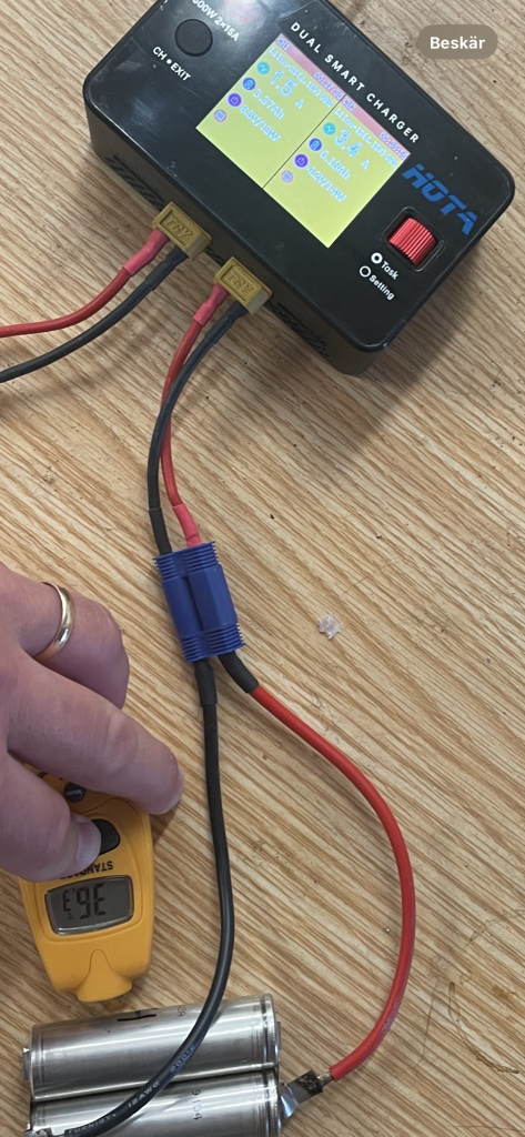 Ska dela på cellerna till halva kapaciteten men fortfarande blir 4(00)V resp 8(00)V kvar, för att kunna köra med 2C.