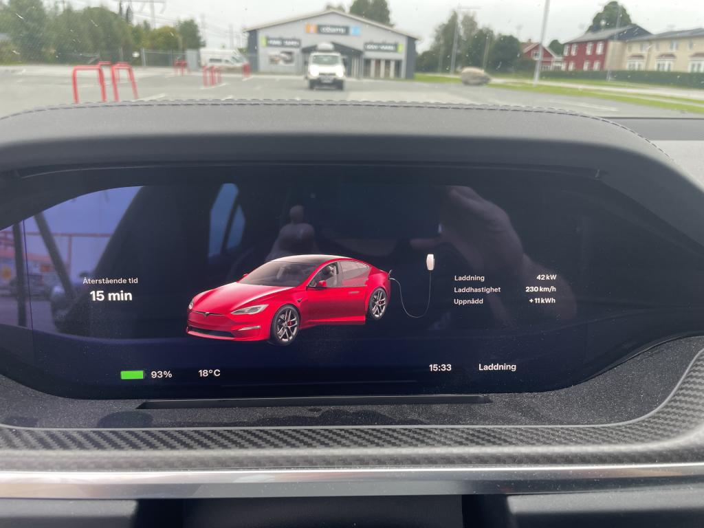 Vid just över 90% laddade bilen 42kW enligt skärmen, dvs det som kommer in i bilen.
