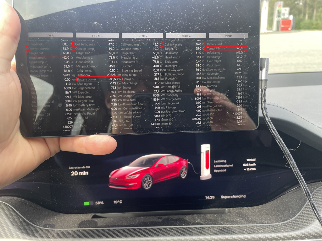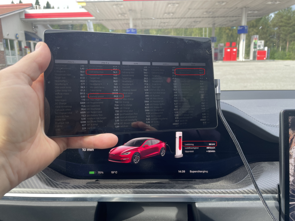 Cell temp 56C, statorn på väg nedåt men battery inlet fortfarande aningen över och värmer lite än.