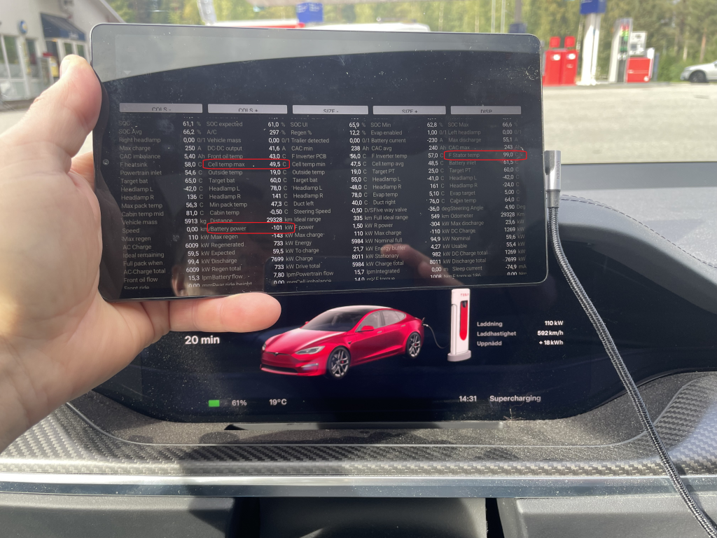 Cell temp 49.5, 101kW laddning, fortfarande 110kW in. Stator temp synlig, yes det värmer batteriet. Inte kyler.