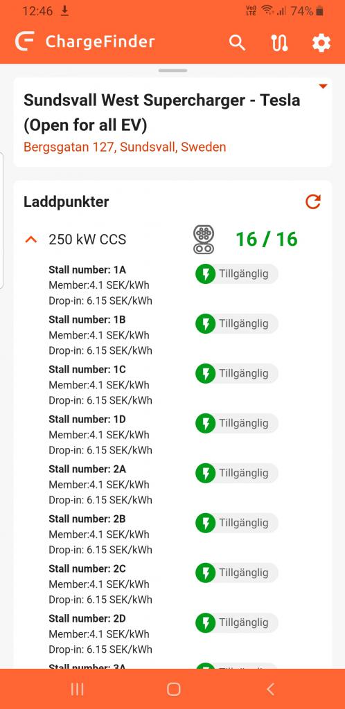 Kollade i Chargefinder appen vid lunchtid idag hur det såg ut i Sundsvall där jag ofta laddar, om det nu stämmer.