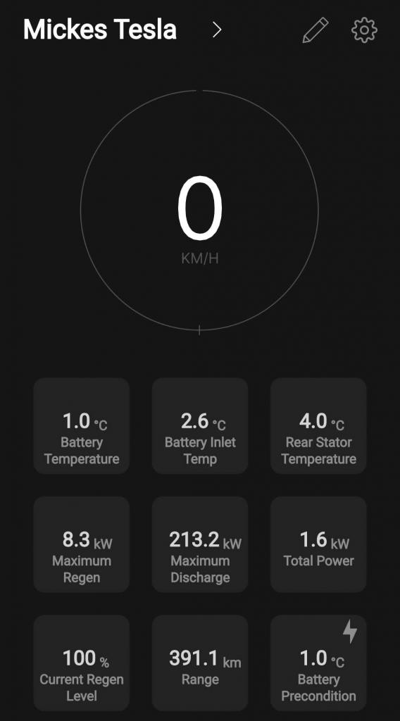 När jag parker hemma igen så har vi 7.3°C i batteritemp och gått från 91% till 87% på batteriet.