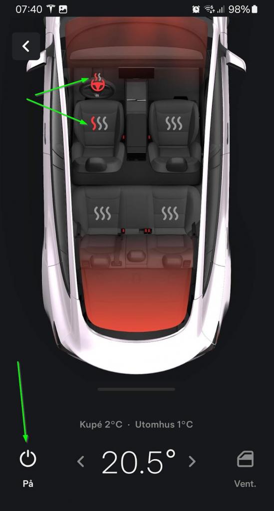 Förvärma batteriet behövs inte vid så kort sträcka men en varm kupé är alltid trevligt. Enklast är att bara starta klimatanläggningen från appen med önskad temperatur. Är det riktigt kallt väljer du att avfrosta bilen.