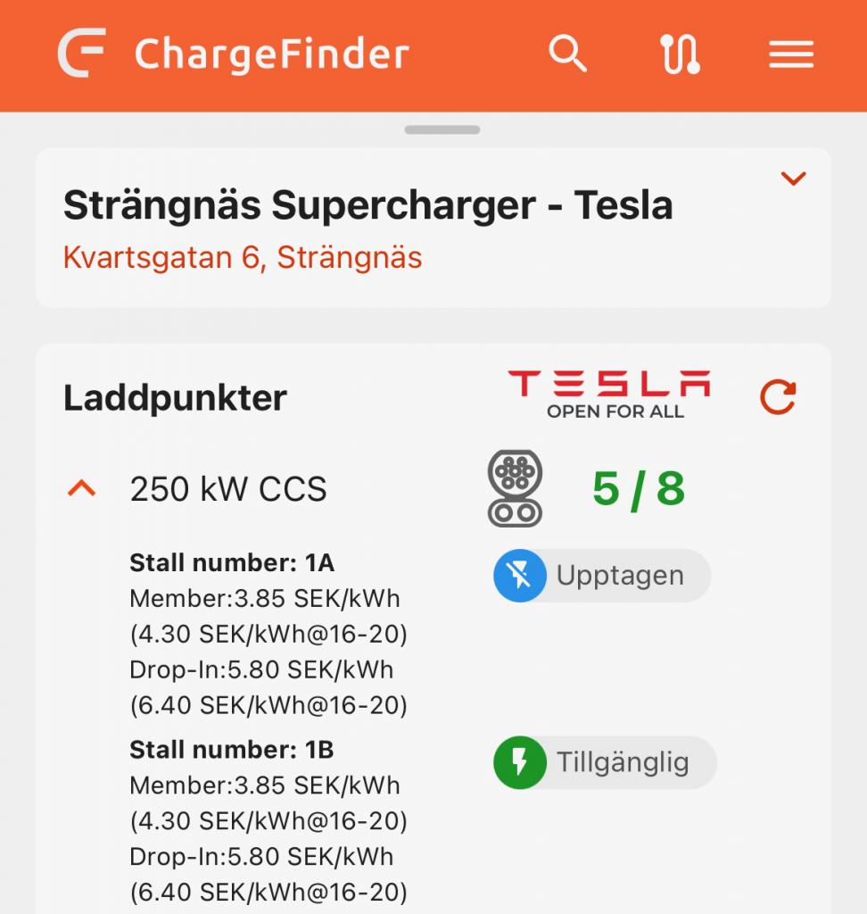 Priser visas för Superchargers som är öppna för alla elbilar. Reltidsstatus visas för alla Superchargers.