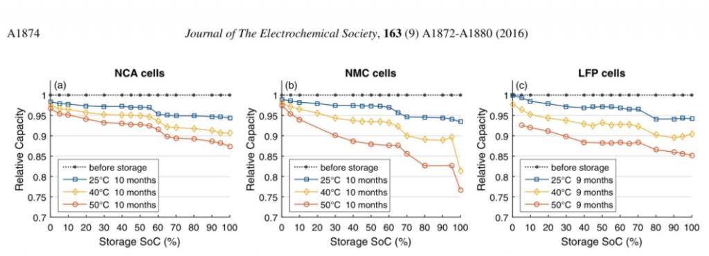 Bilden visar att ~ 70-100% degraderar väldigt lika vid normala celltemperaturer (calendar aging).