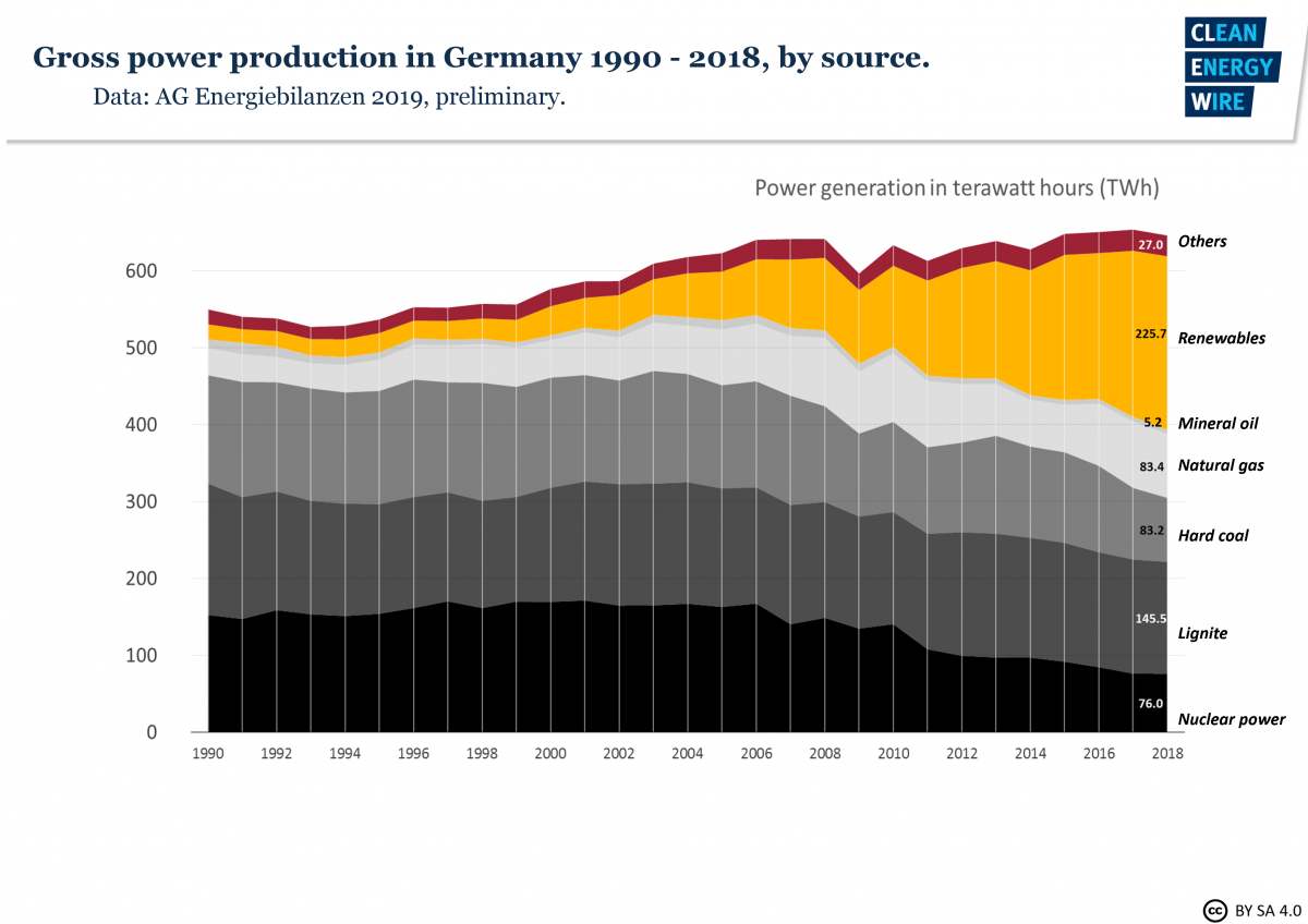 Tyskland är väl förvisso ett av de länder med mest ambitiösa planer för att ställa om sin elproduktion mot förnyelsebar sådan. Länder som Sverige och Norge brukar framhållas som bra exempel men vi har det ju också rätt väl förspänt i och med våra älvar och våra små befolkningsmängder. Hur hade vår elproduktion sett ut utan älvarna? Tyskland lyckas ju faktiskt minsta sin elproduktion från både fossila kraftverk och kärnkraftverk samtidigt, inte helt enkelt. Detta också samtidigt som den totala produktionen ökar något.