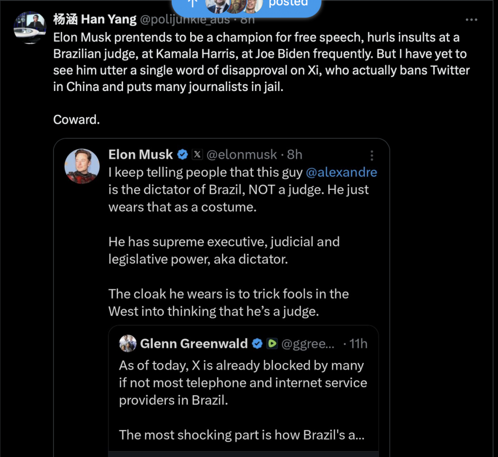 Elon har däremot inga problem med att Xi Jin Ping blockerar Twitty för 1,4 miljarder i Kina.