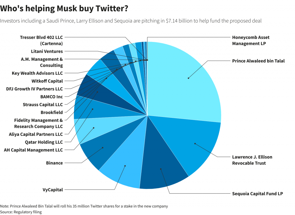 Finns det ngt ställe på I-net där det framgår hur mycket av den totala köpeskillingen på $44 miljarder som kommer från andra än Elon och hur mkt pengar det handlar om?