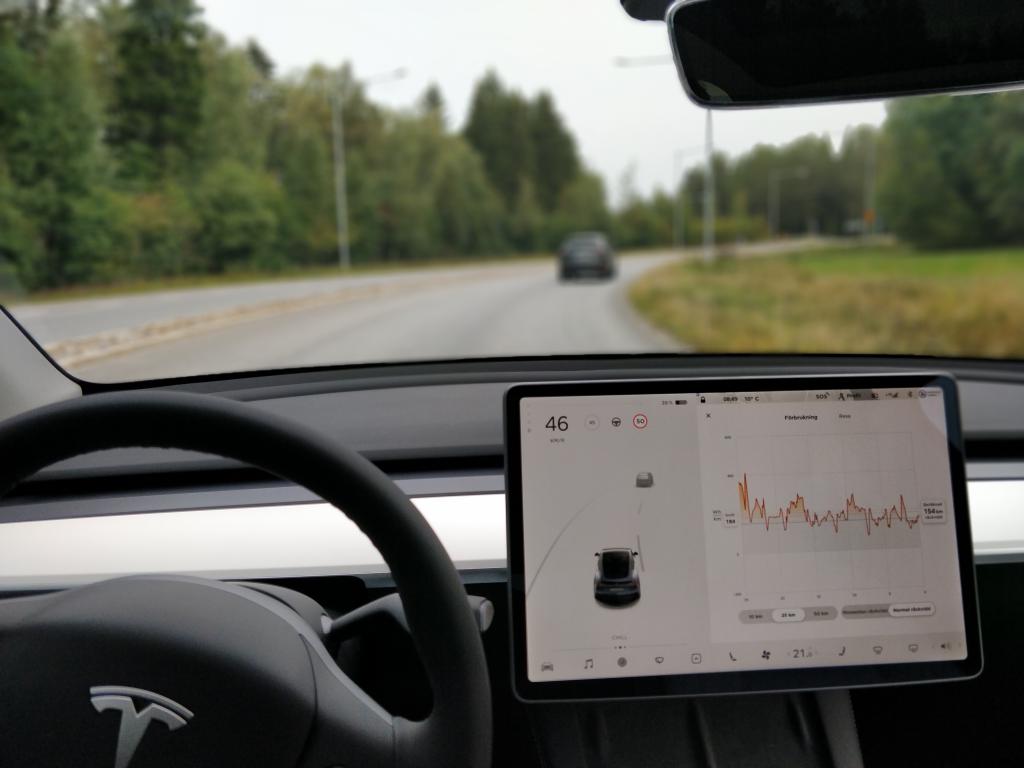 Trots att jag börjar vänja mig vid elbilars snabba respons och acceleration kändes Model Y väldigt pigg i hela registret från 0 till 140. Bilen är generös med körglädje. På den kurviga sträckan Tomtebo - Yttertavle kändes den väldigt stabil utan att kränga i kurvorna. Jag körde med styrningen i normalläge (det finns komfort, normal och sport) och bilen låg som klistrad vid vägen.