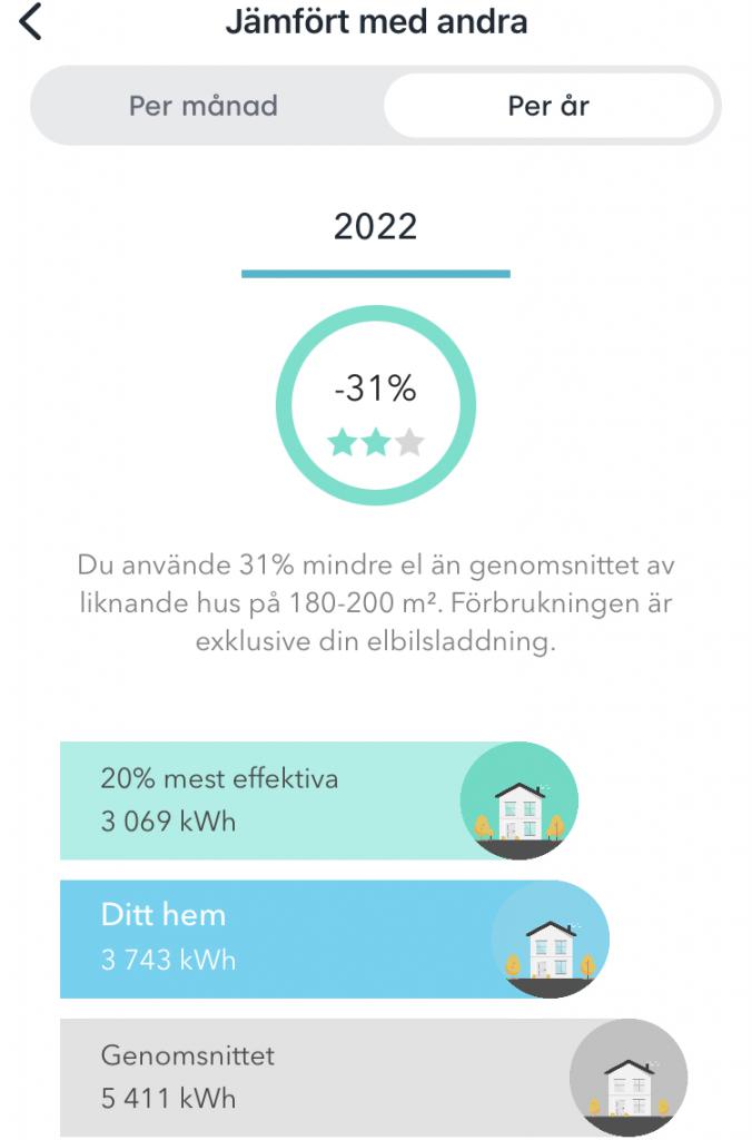 Är det verkligen lågt? Vi har villa från 2022 med FV på 164m2 plus 30m2 garage. Fyra i hushållet. Två värmepumpar för kyla sommartid (oh boy gick de konstant i somras) Hittills är förbrukningen från 01.01.2022 totalt 3743kWh, räknar med att vi landar på runt 4500kWh exkl. elbil i år.