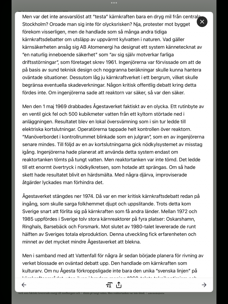 Rekommenderar alla att läsa Per Högselius (Professor i Teknikhistoria, KTH) hela artikel i SvD den 16 mars 2023 samt besöka den pågående utställningen på Tekniska museet i Stockholm. Själv hade jag förmånen att få besöka kärnkraftverket med intakt kontrollrum innan det började rivas.