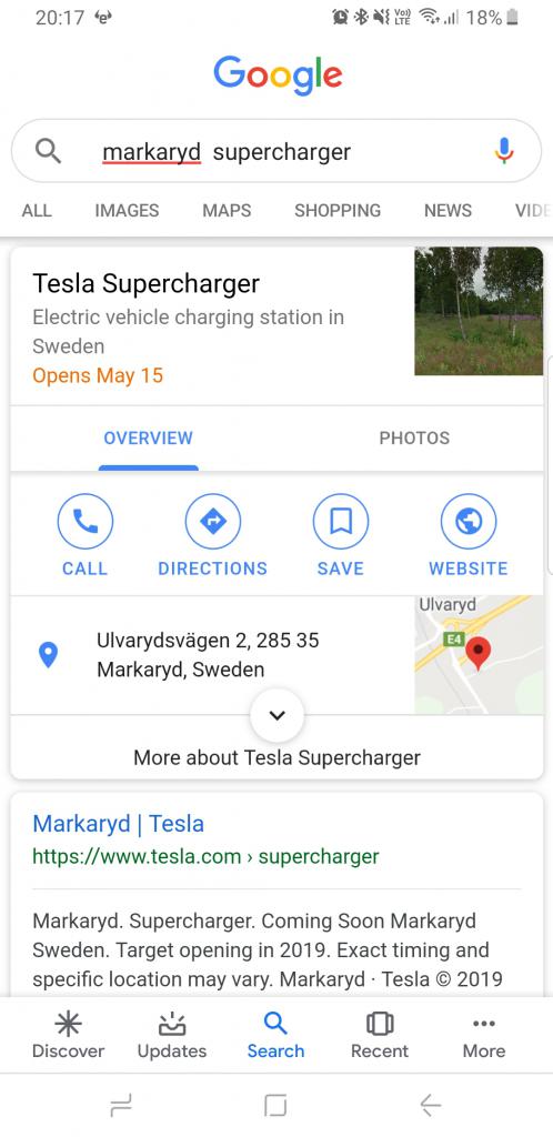 Søk på Markaryd supercharger og Google sier den åpner 15 mai. Tilsvarende søk på norske superchargers under bygging ser troverdig ut.