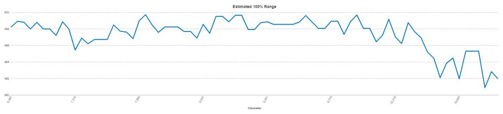 494 km @ 100% ( några få km lägre än när bilen var ny)