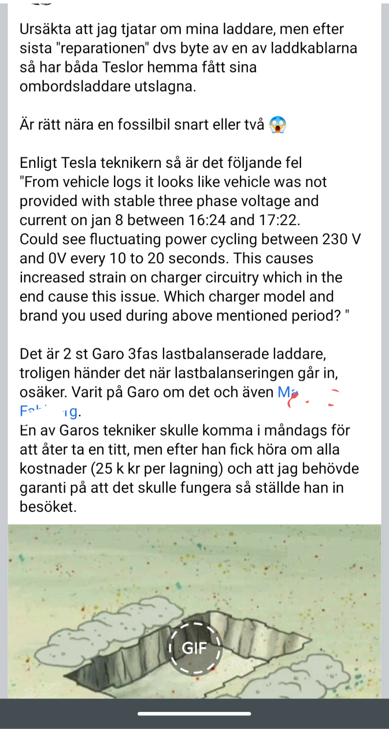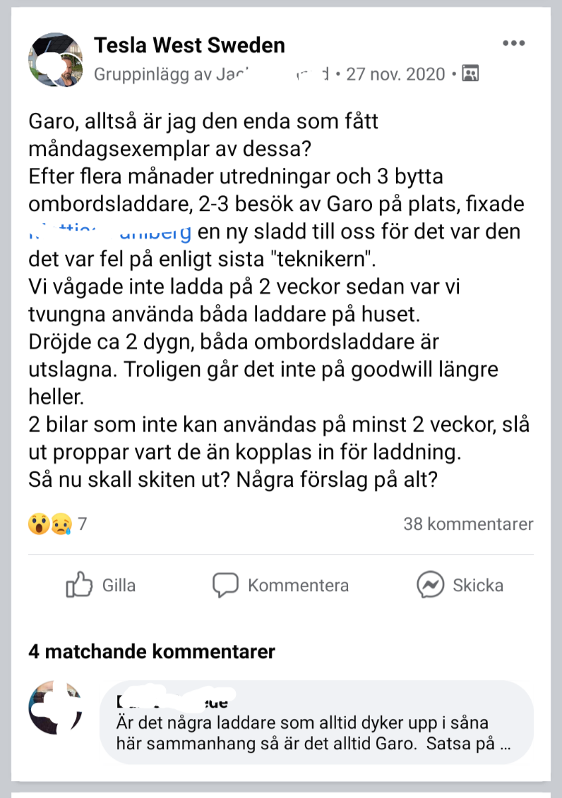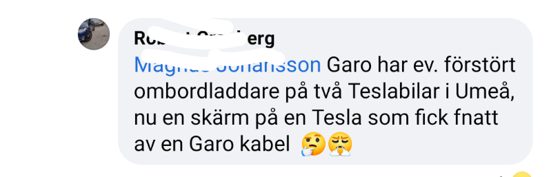 Skulle GARO även bränna ombordsladdarna så borde nån påtala detta till dem så de kan åtgärda problemet.Gustafsson skrev:Hur skulle en garobox kunna ”bränna” en tesla? Men inte andra elbilar? Det är väl trefas 220 i dem också? Finns det något dokumenterat fall?