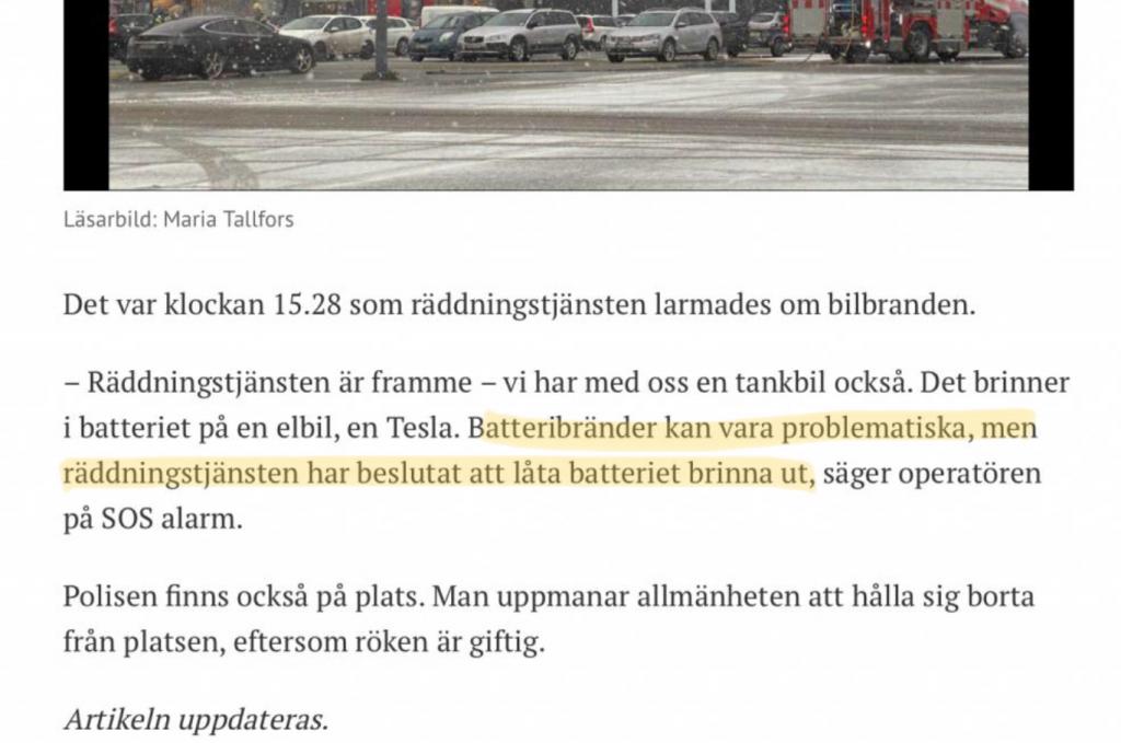 De tänker ju låta bilen brinna färdigt eftersom de inte vet hur man släcker en brand i en Tesla. Enligt Tesla ska mycket vatten användas för att släcka branden.jon357 skrev:Brandmännen på plats har garanterat koll hur de ska agera även om jag faktiskt tror att detta är Nerikes brandkårs första brand i elbil. Jag kan ha fel men jag är själv brandman i Nerikes brandkår och har inte hört om någon elbilsbrand i våra internutbildningar och övningar tex. Antar att underlag till utbildningen byggts på idagLarsL skrev:Hur vet de att det är batteriet som brinner? Om de har så dålig kunskap att de inte et hur man släcker en elbilsbrand så tror jag inte de kan avgöra om det är batteriet som brinner eller inte.