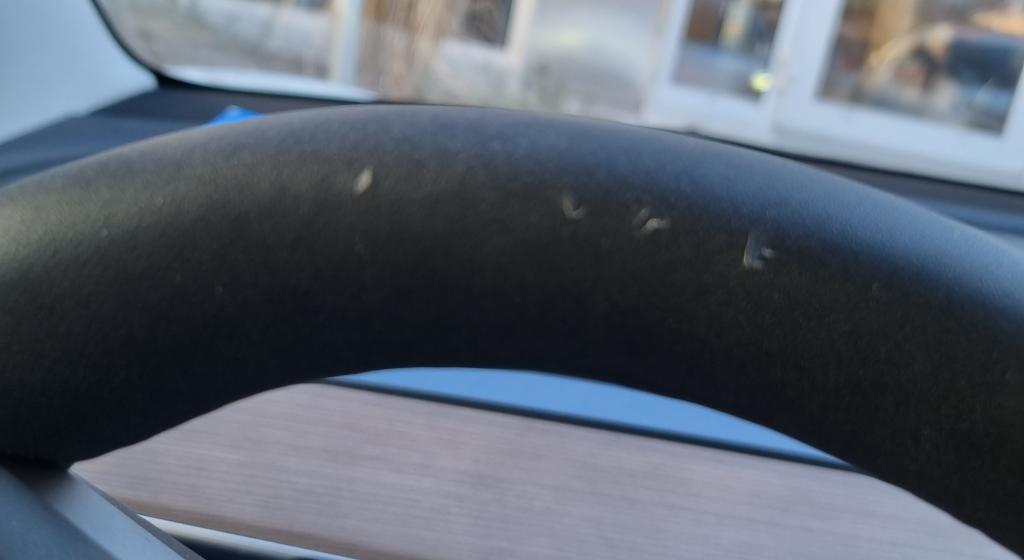 Ej lånat ut bilen, någon som haft ringar på sig eller haft dörren öppen så kvarterets katt fått möjlighet att känna på ratten. Ser ej ut som vanligt slitage.