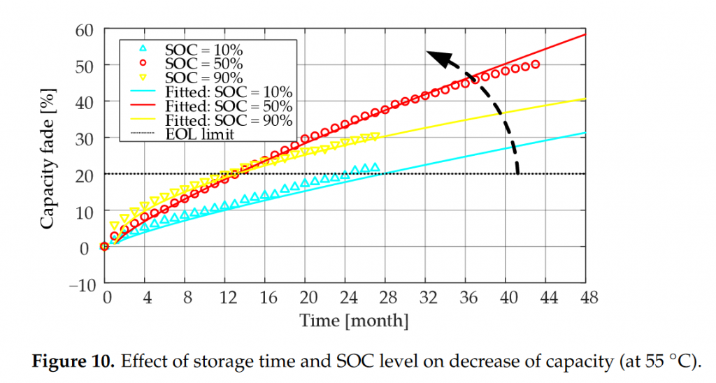 Tittar man på Figur 12 och fokuserar på området där de har data (alltså 40 respektive 55 grader), så ser man att cellerna åldras som förväntat, med längst livstid vid 10% SoC, och sen minskande livstid vid 50% respektive 90% (titta på z-värdet vid punkterna i figuren). Även Figur 9 visar detta, om man fokuserar på området fram till 20% av kapaciteten förlorats (vilket de betraktar som en of life).